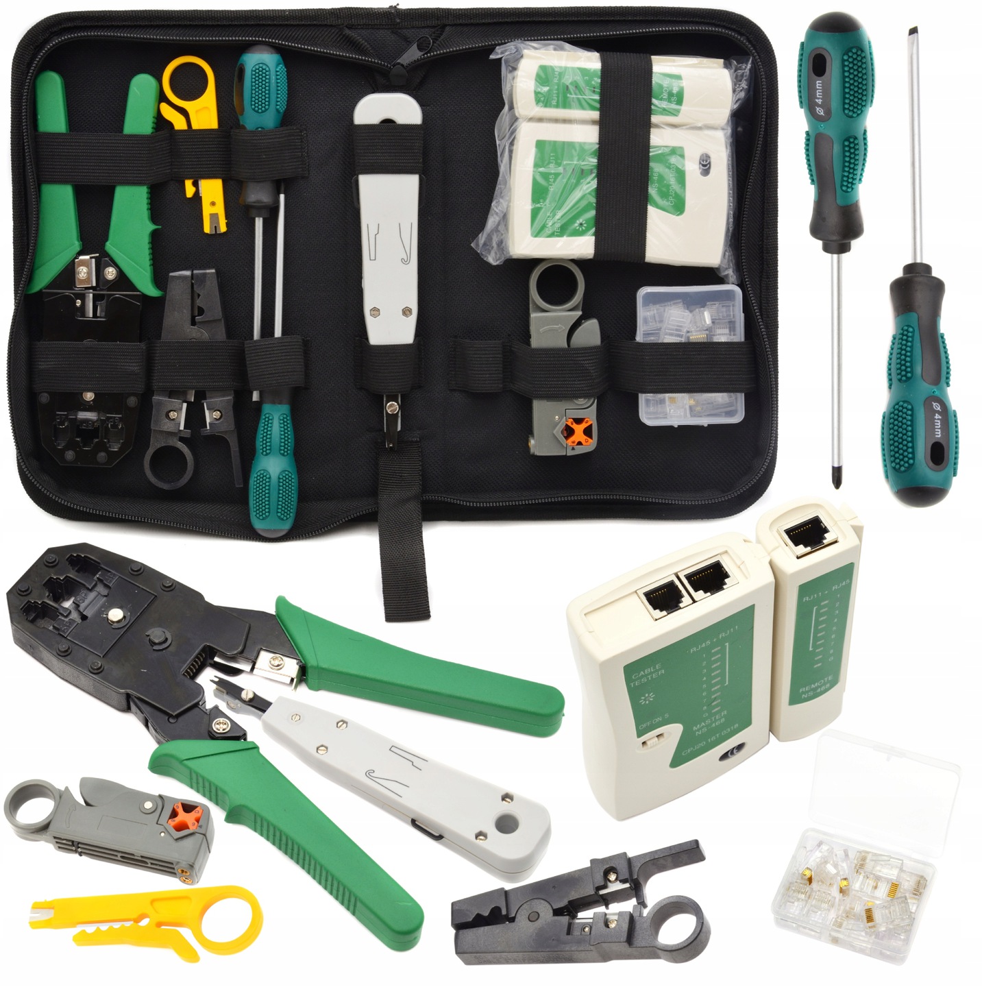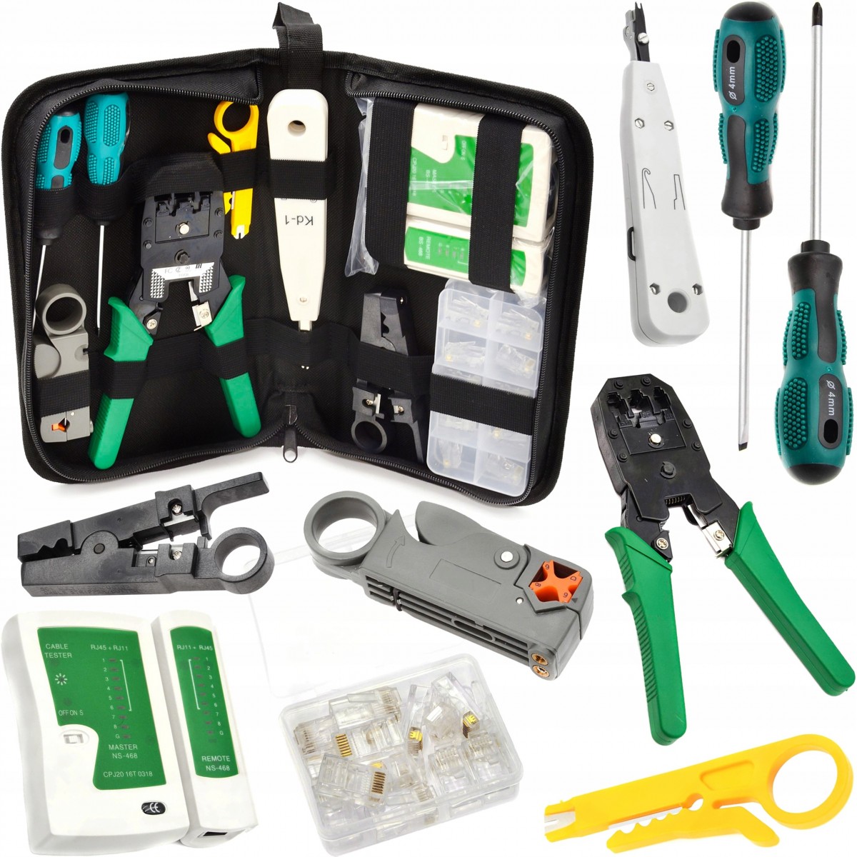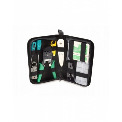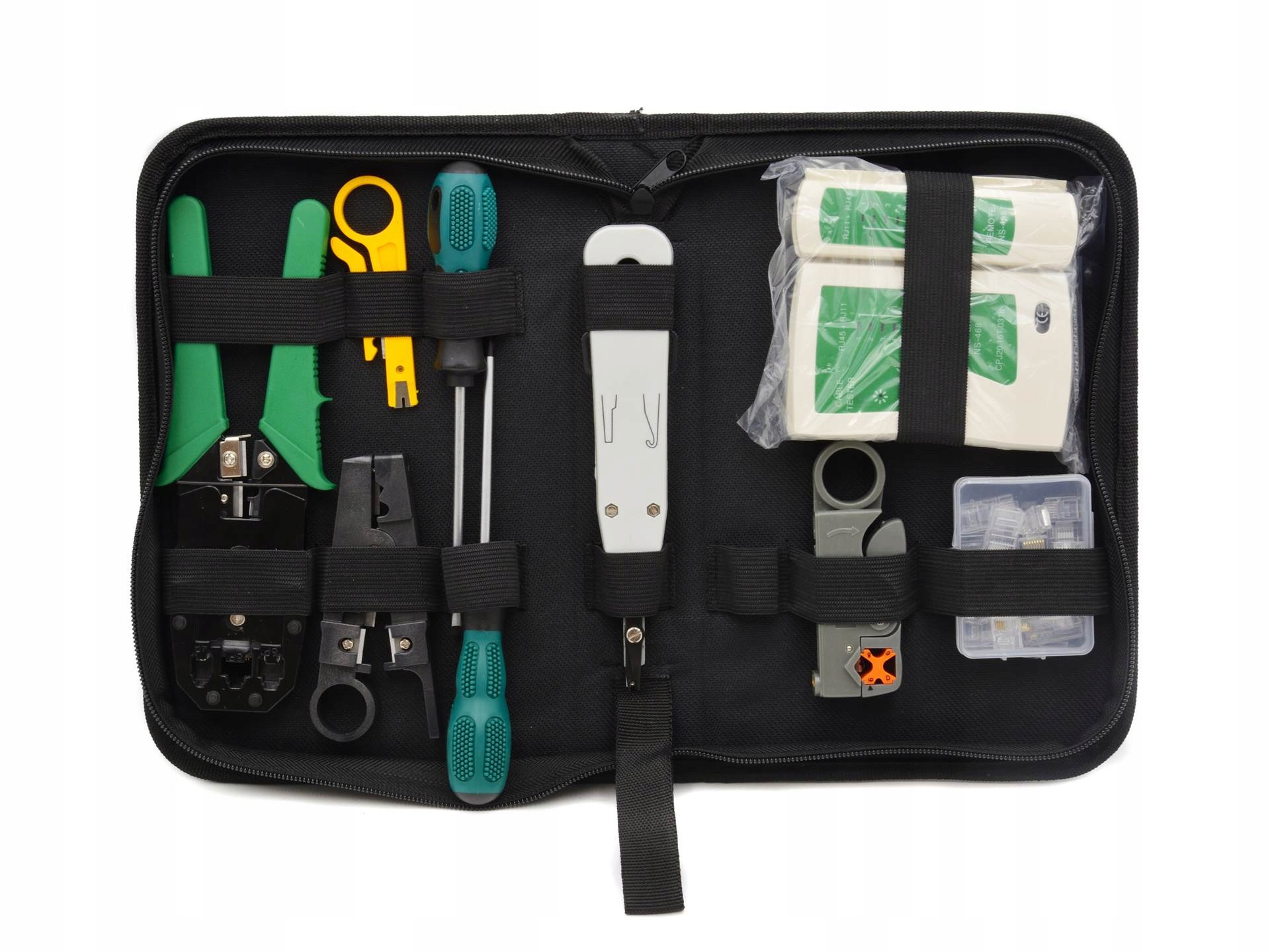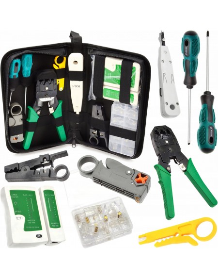 W zestawie znajduje się tester kabli, zaciskarka, wciskacz, wtyki RJ 45, stripper, śrubokręt płaski i krzyżak oraz narzędzia do cięcia kabli. Całość pozwala na usunięcie wszelakich usterek i jest niezbędnikiem każdego instalatora sieci.