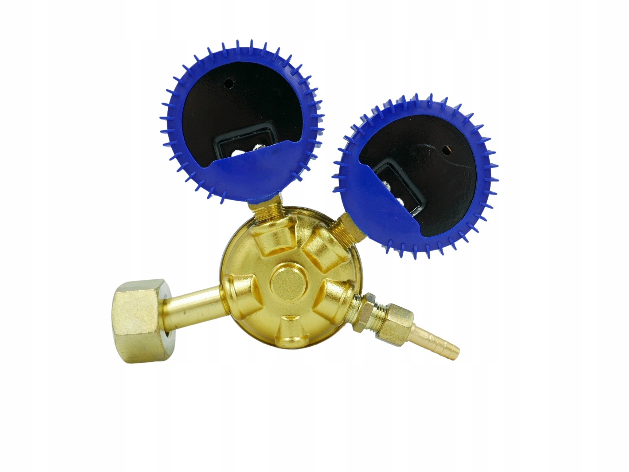 Reduktor butlowy z dwoma manometrami, przeznaczony do tlenu.