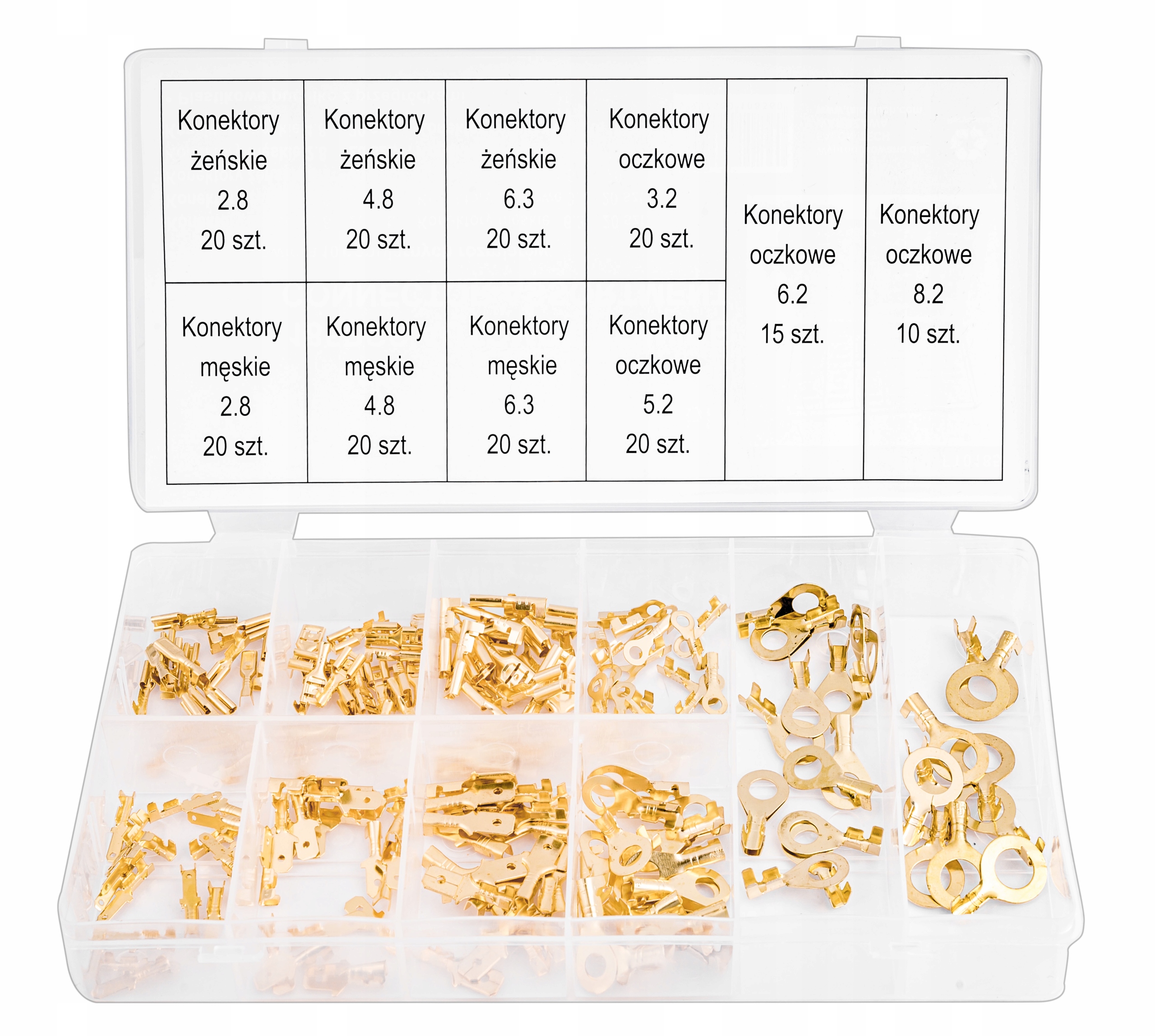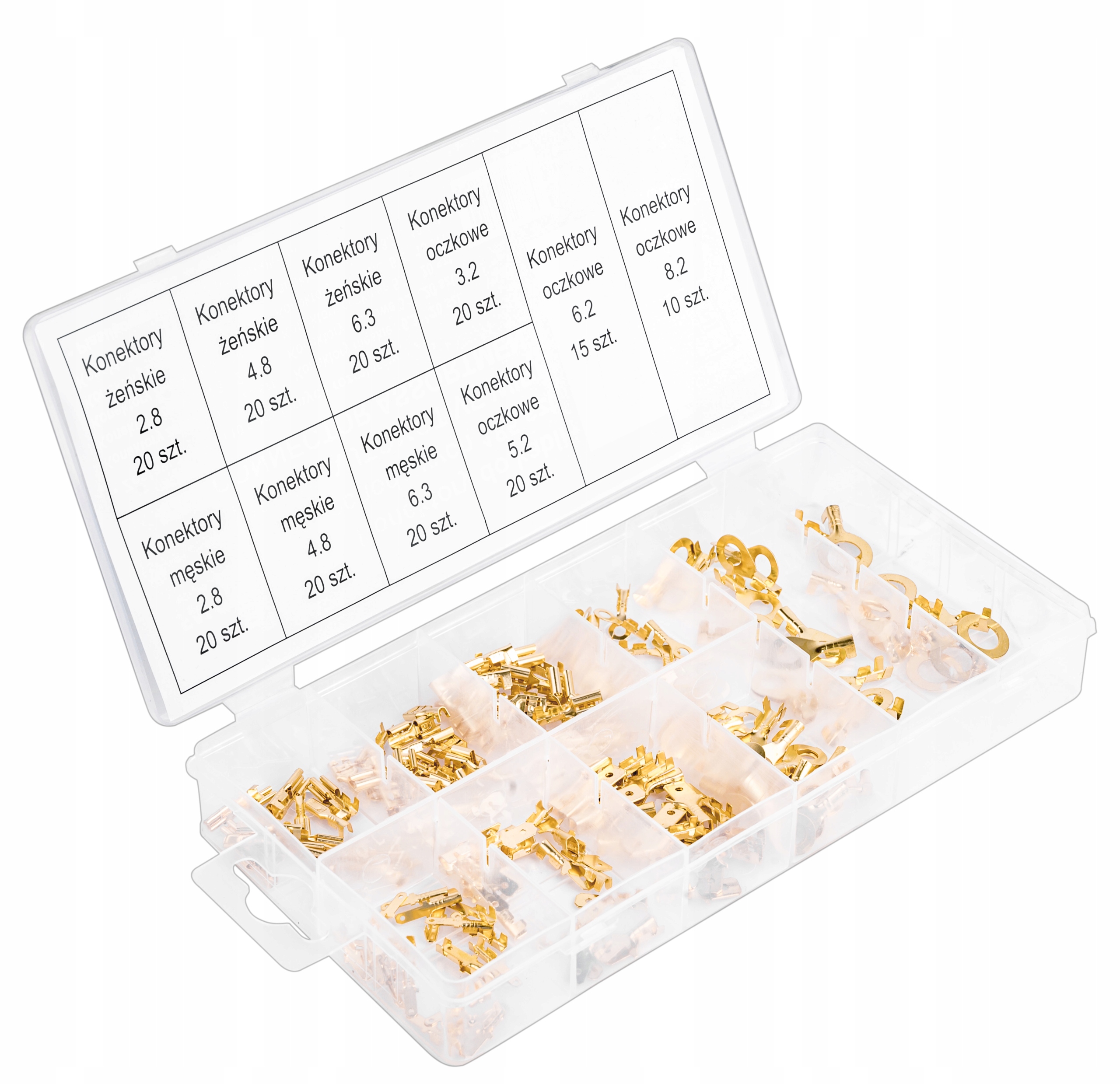 Zestaw zapakowany jest w pudełko plastikowe, posegregowane rozmiarami, przeźroczyste- dzięki czemu łatwo skontrolujesz ilość konektorów.
