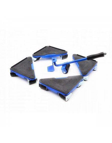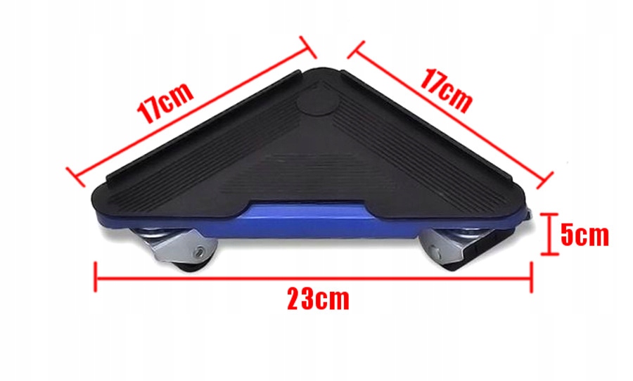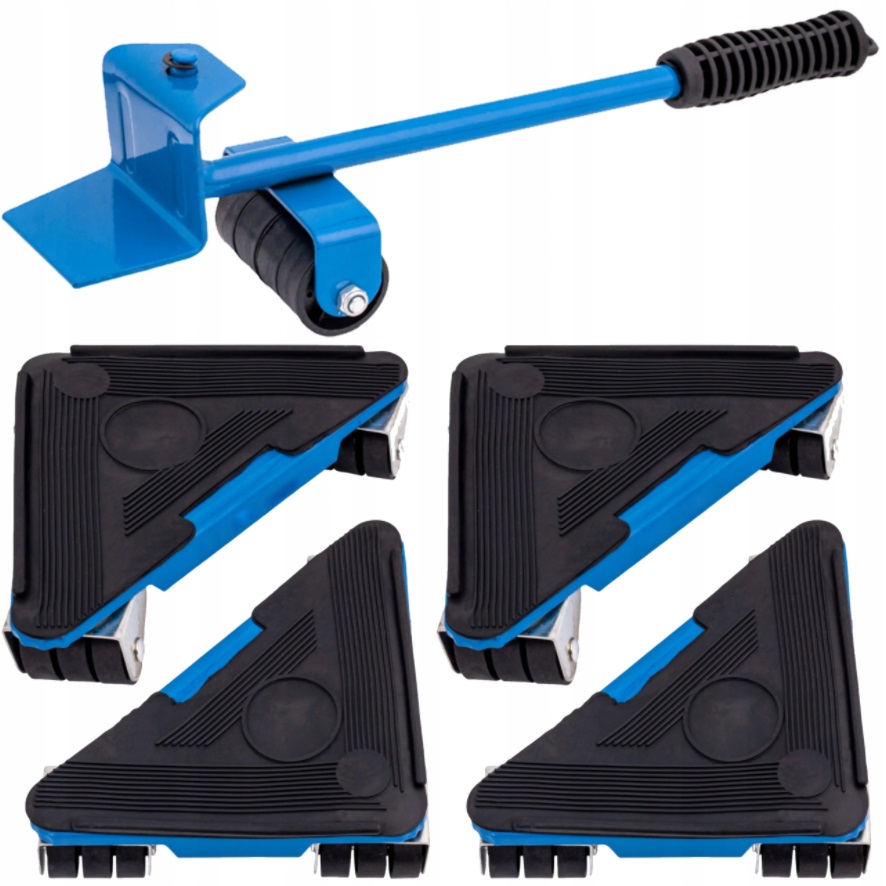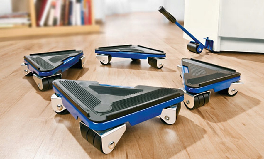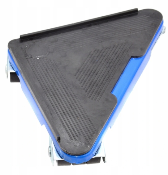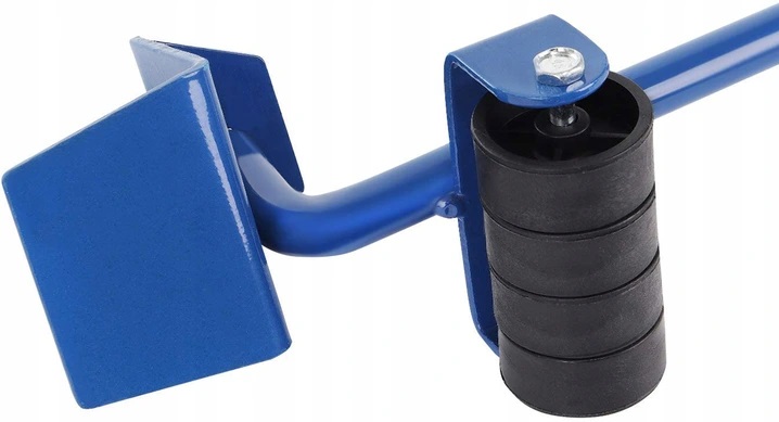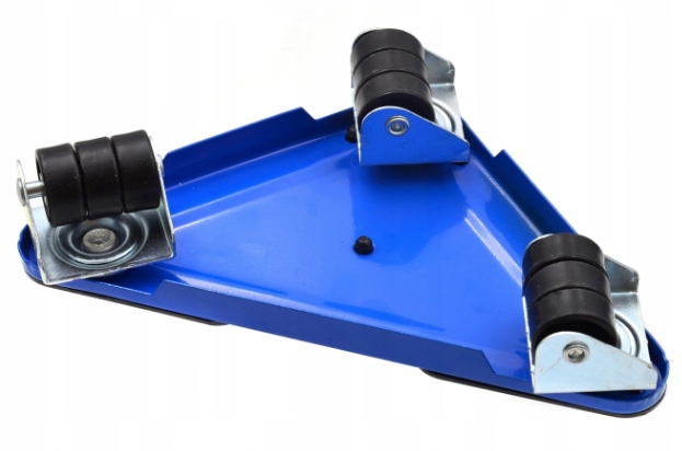 Unieść krawędź, narożnik mebla za pomocą dźwigni , wsunąć płytkę z rolką i opuścić ładunek. Podobnie postąpić z pozostałymi rolkami.