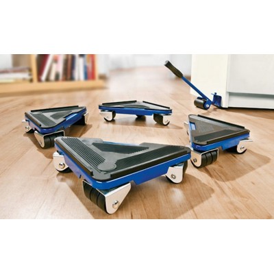 Zestaw metalowych podstawek GEKO G29800 z rolkami przeznaczony do transportu i ustawiania mebli lub innych ładunków o ciężarze do 300 kg.