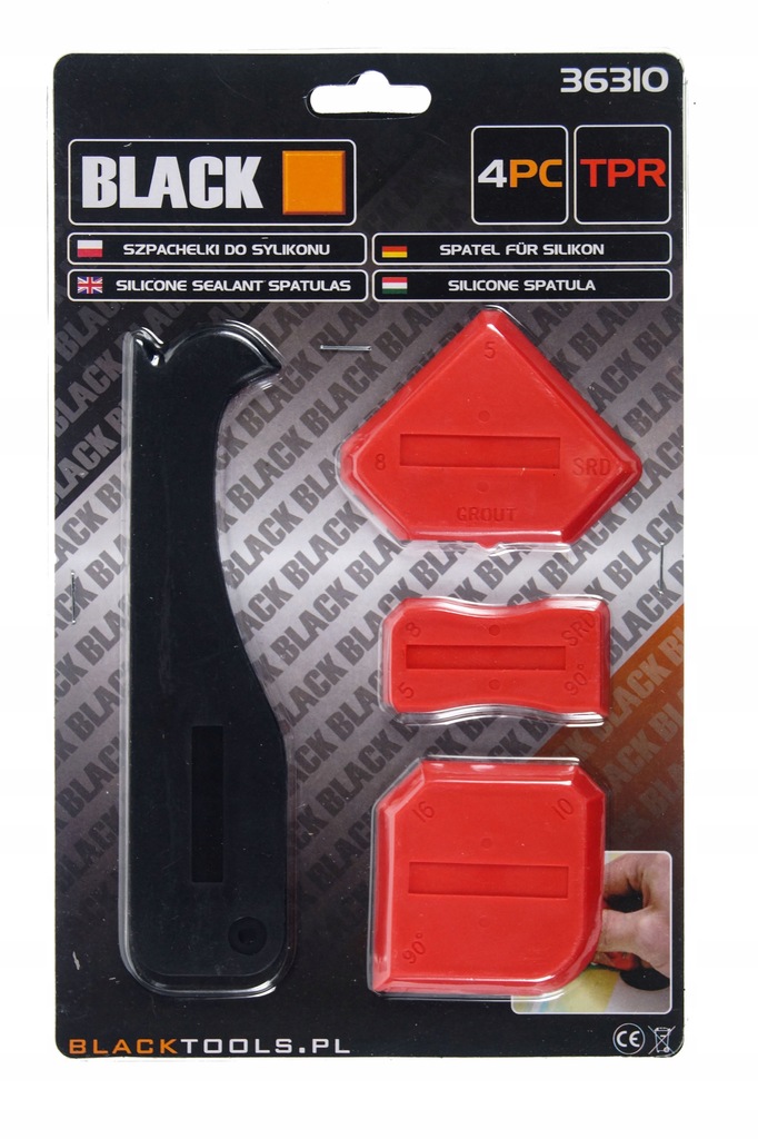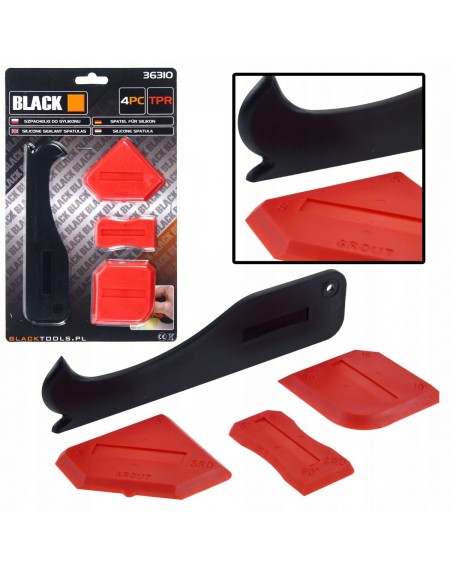 Zestaw 4 szpachelek wykonane z gumy termoplastycznej, do której nie przywiera silikon do nakładania świeżej masy uszczelniającej (silikonu, fugi). Umożliwiają uzyskanie czystej, równomiernie gładkiej powierzchni masy uszczelniającej. Nie uszkadzają krawędzi i nie rysują glazurowanych powierzchni.