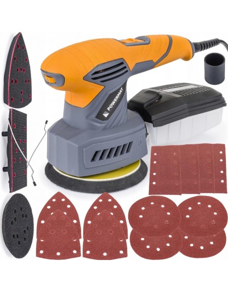 W celu szlifowania wielofunkcyjnego - mimośrodowego i oscylacyjnego szlifierka posiada możliwość zamontowania 3 różnych padów szlifierskich (Orbitalny - do szlifowania płaskich powierzchni; Trójkątny - do szlifowania powierzchni nierównych; Prostokątny - do szlifowania narożników i krawędzi).