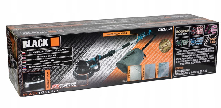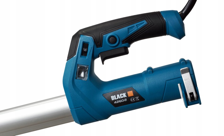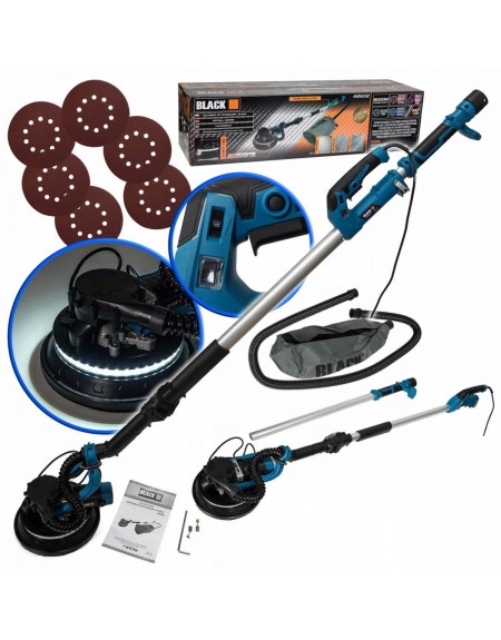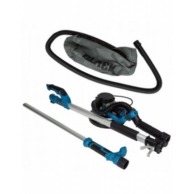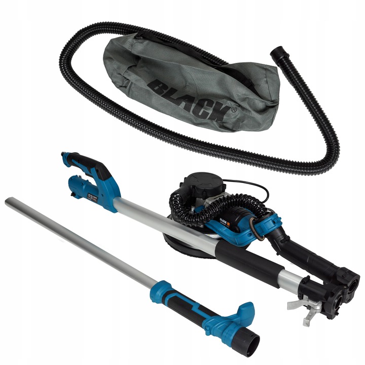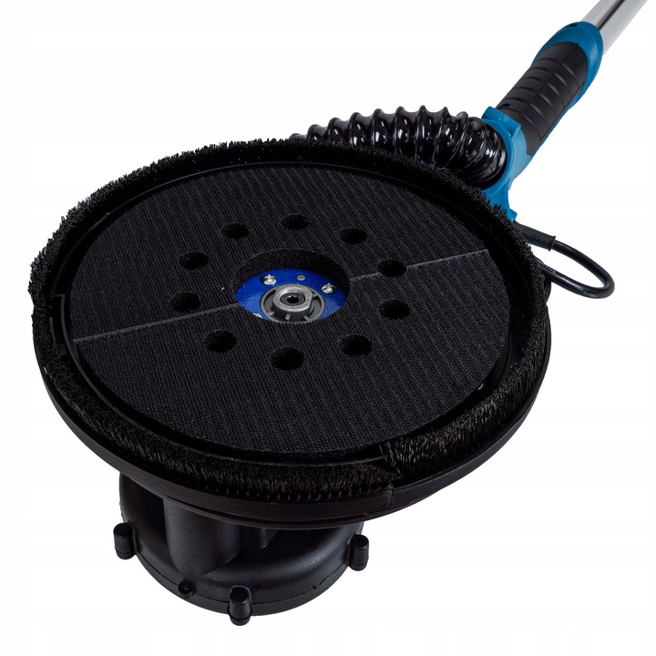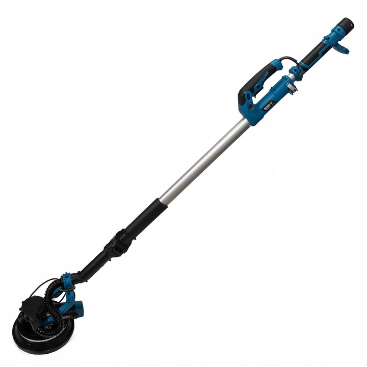 Teleskopowy, wysuwany aluminiowy trzonek szlifierki zakończony dodatkowym uchwytem pozwala na jej użytkowanie na różnych wysokościach.