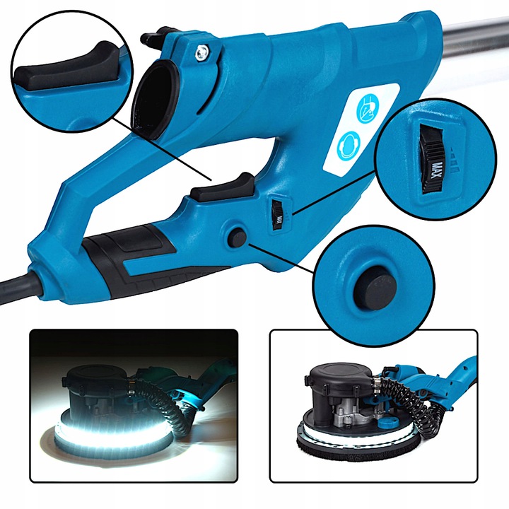Urządzenie posiada podświetlenie LED 360o wokół tarczy dzięki czemu nie potrzeba używać dodatkowych halogenów podświetlających ścianę. Obszar roboczy jest doświetlony dokładnie tam gdzie aktualnie szlifujemy, sprawia to że praca jest bardziej precyzyjna a zamierzony efekt łatwiejszy do uzyskania.